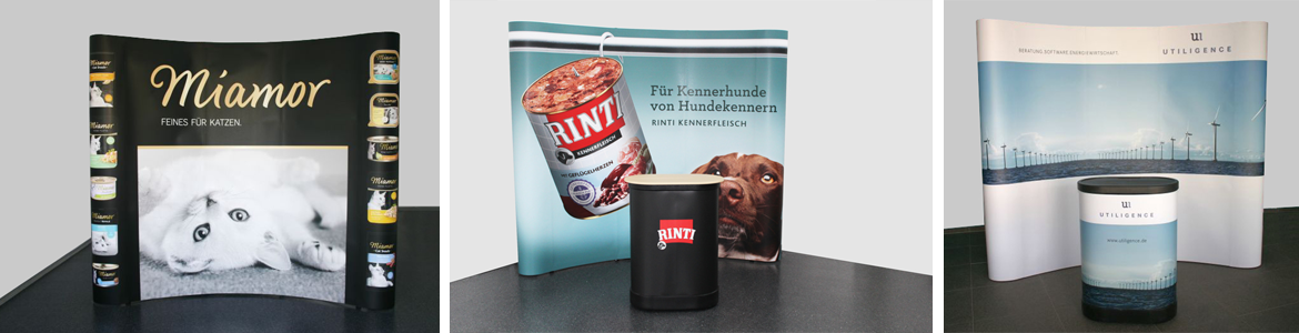 Die Messewände sind in gerader und gebogener Form, mit vorderseitiger und wahlweise rückseitiger Bedruckung, erhältlich.